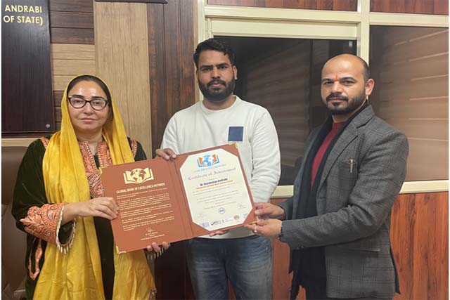 Dr H R Rehman Director (GBER) presented Global Book of Excellence Records to Shri Tayyab Jeelani first Tribal Student from Reasi Jammu Kashmir who bagged Gold Medal in Urdu department university of Jammu.